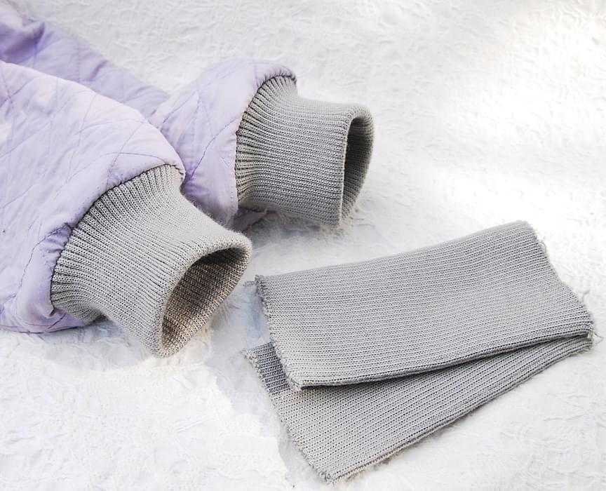 Вязаную резинку сложить пополам, отмерить необходимую длину резинки для манжет (обернув вокруг запястья), отрезать по мерке. Затем разверните манжеты в один слой и стачайте по коротким сторонам. Перегните обе детали манжеты пополам лицевой стороной наружу, сложите каждую манжету с нижним припуском рукава, совместив швы и, слегка растягивая резинку, притачайте оверложным швом, одновременно обметывая края.