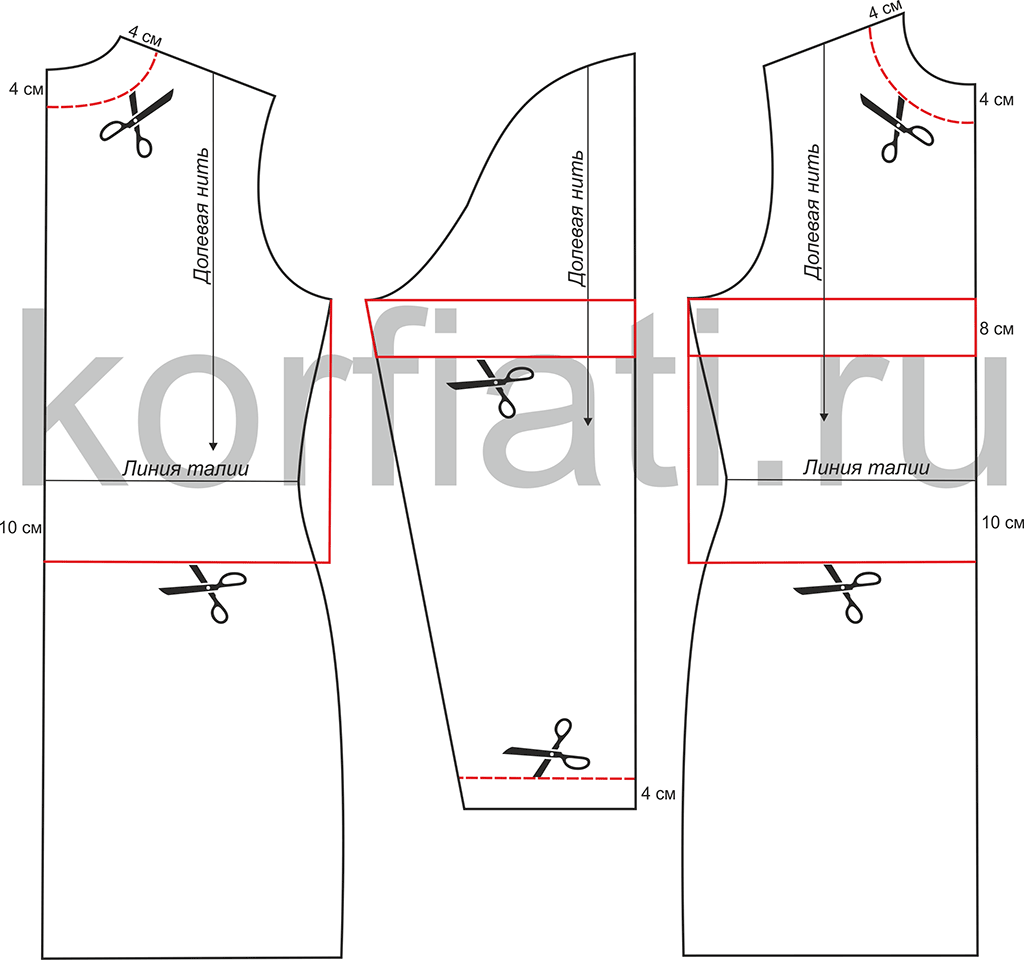 Углубите вырез горловины переда на 4 см и проведите новый вырез горловины переда. От нижней точки проймы проведите вертикальную линию бока, опустите ее на 10 см ниже уровня линии талии. Проведите горизонтально линию низа переда.