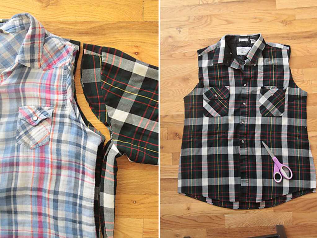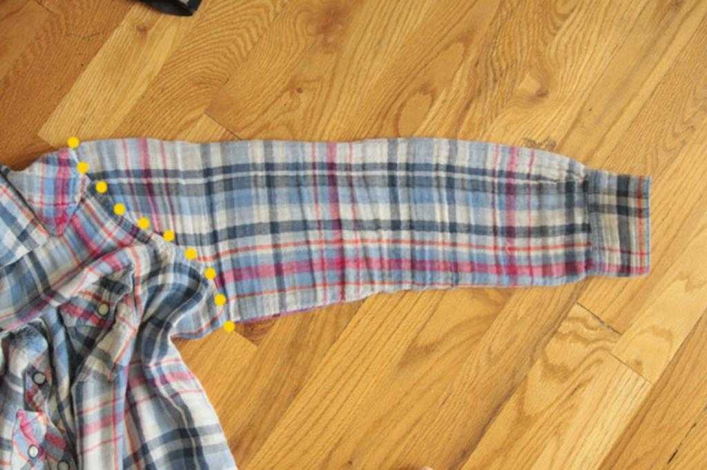 Используя подходящую рубашку в качестве ориентира, обрежьте рукава и излишки по бокам рубашки большего размера, которую вы планируете исправить.