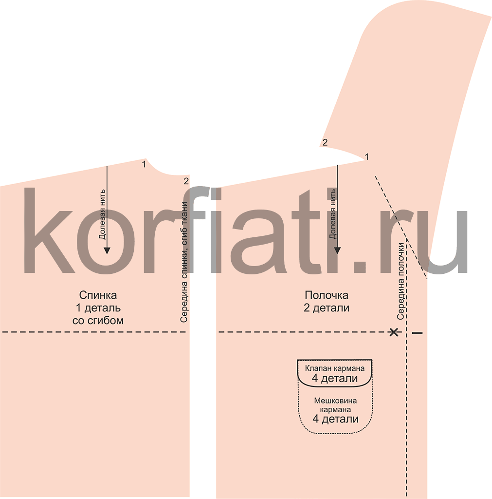 Ту же самую схему используйте для того, чтобы получить две детали полочки — просто разрежьте потом такую же деталь (со сгибом) как раз по линии этого сгиба ткани.