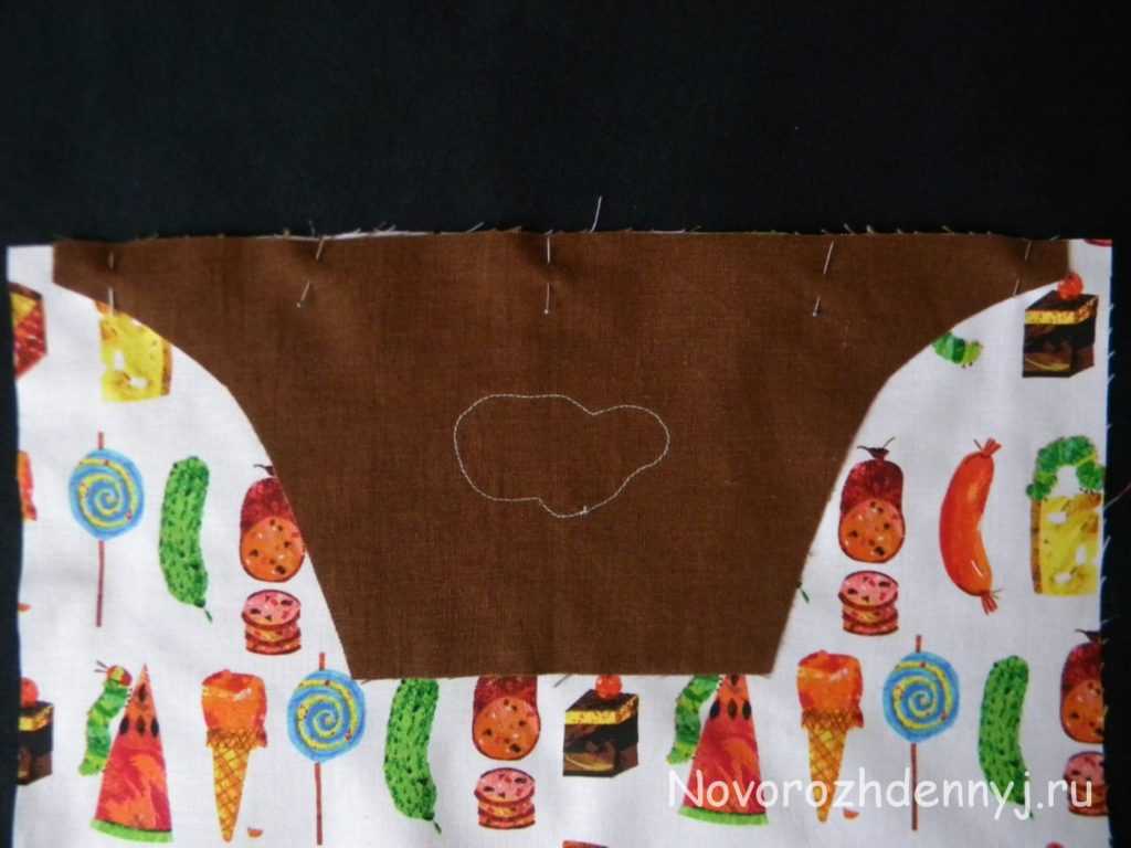 Теперь пришиваем кармашек. Кладем его по центру фартука, фиксируем булавками и прострачиваем с трех сторон по внешнему краю бейки.
