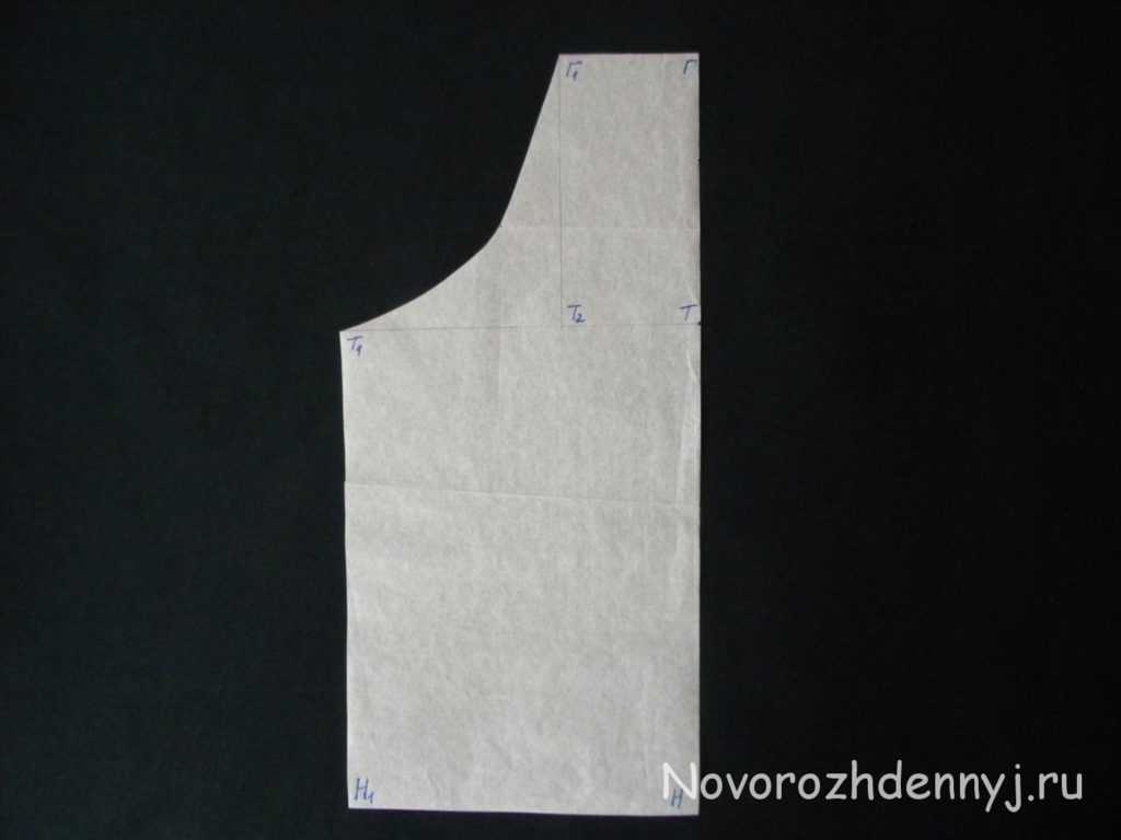 - От точки Т влево проложите опять же 20 см (длина для талии рассчитывается по той же формуле ПОТ : 2 + 6 см) и поставьте точку Т1. Сомкните точки Т1 и Н1.