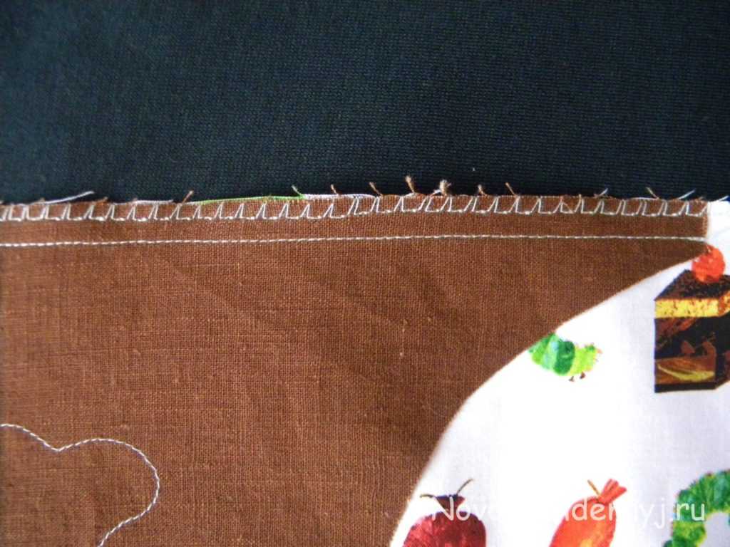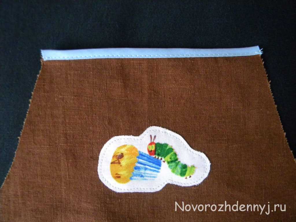 Ура! Почти готово — осталось только пришить кармашек. Но сначала его надо обшить со всех сторон по внутреннему краю бейки как на фото ниже.