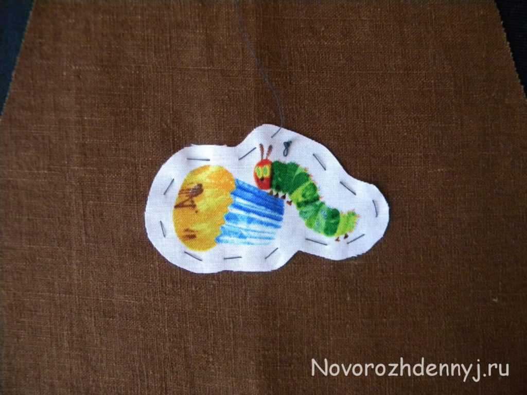 Сначала декорируйте грудку: расположите на ней выкроенный элемент ткани с рисунком, зафиксируйте портняжной булавкой. Затем ручным наметочным швом закрепите края аппликации, а булавку выньте.