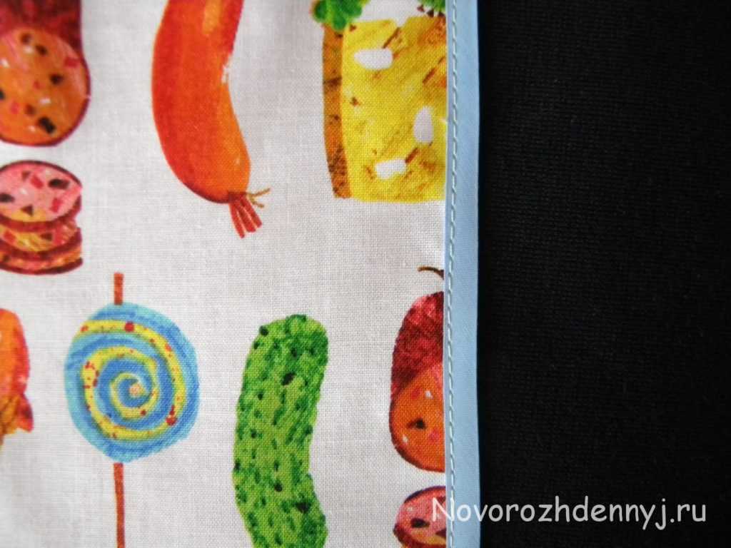 Дальше по желанию можно вырезать прямоугольную деталь для кармана, отделать ее бейкой и пришить к основе. Маленькому повару наверняка захочется, чтобы он состоял из нескольких отделов и был многофункциональным. Для этого просто проложите 1-2 вертикальные строчки в нужных местах.