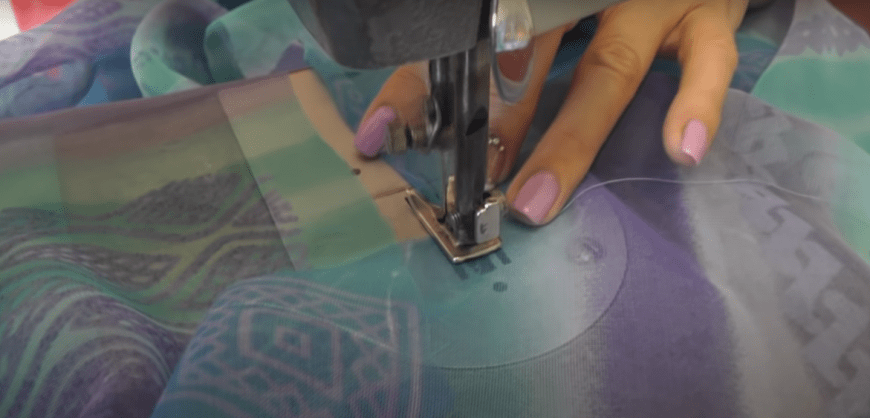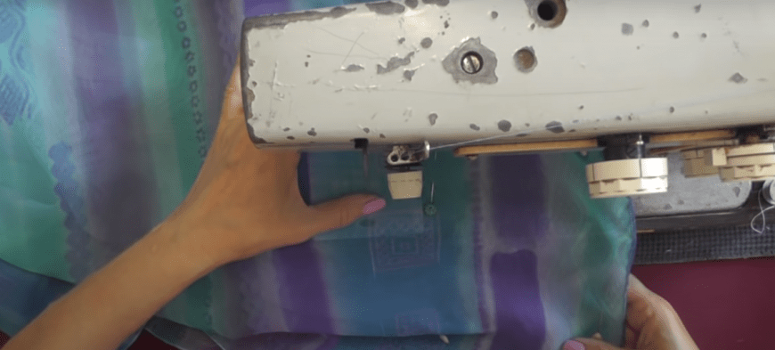Осталось только обработать нижний край. Для этого ткань подворачивается внутрь и прострачивается по передней стороне. Однако тянуть ткань крайне не рекомендуется. Низ приглаживается утюгом. Теперь изделие готово.