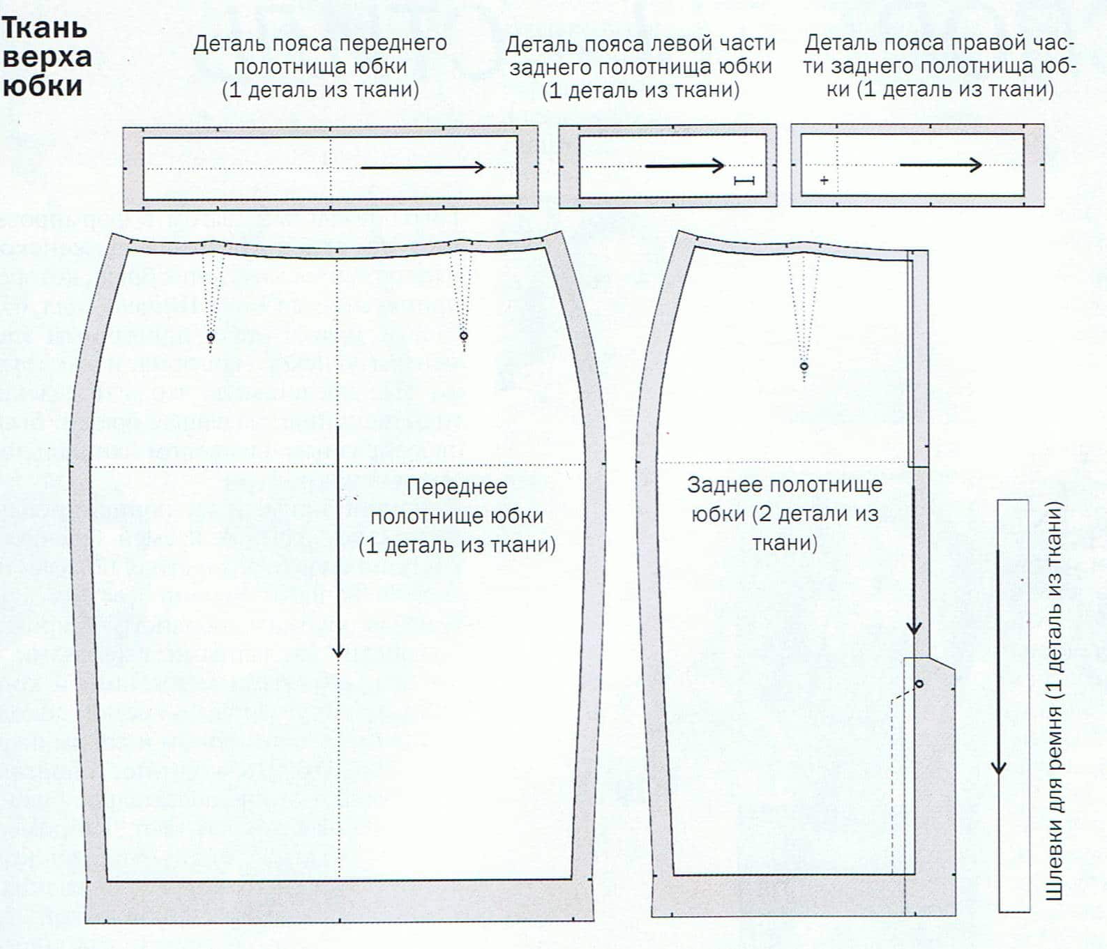 Ширина полотна высчитывается так же, как и для одношовной юбки, а длина отреза должна быть равна: Дю х 2 + Р + 15 см или же можно взять два отреза длиной Дю + Р + 6 см (подгиб) + 15 см (пояс).