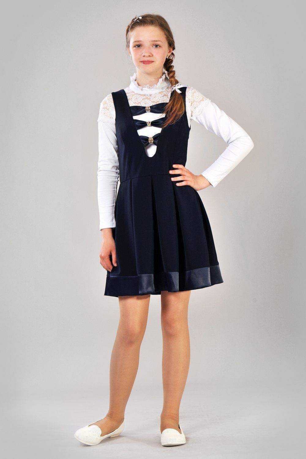 Как и в случае с ученицами начальной школы, на подростках великолепно выглядят сарафаны в синем, бордовом, коричневом исполнении. Темные тона добавляют образу стройности и лаконичности, а декор с кружевными вставками, воздушными жабо или бантами-балстуками добавляют ему нотки женственности и нежности.
