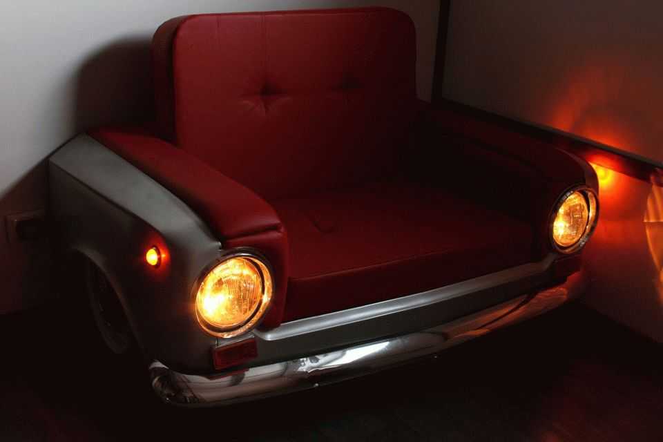 Создать аналогичную модель для взрослых при наличии бездействующего транспорта вполне возможно. Из капотной части автомобиля можно организовать уютный диван, а фары использовать как осветительный прибор.