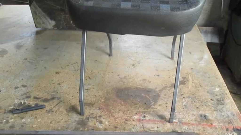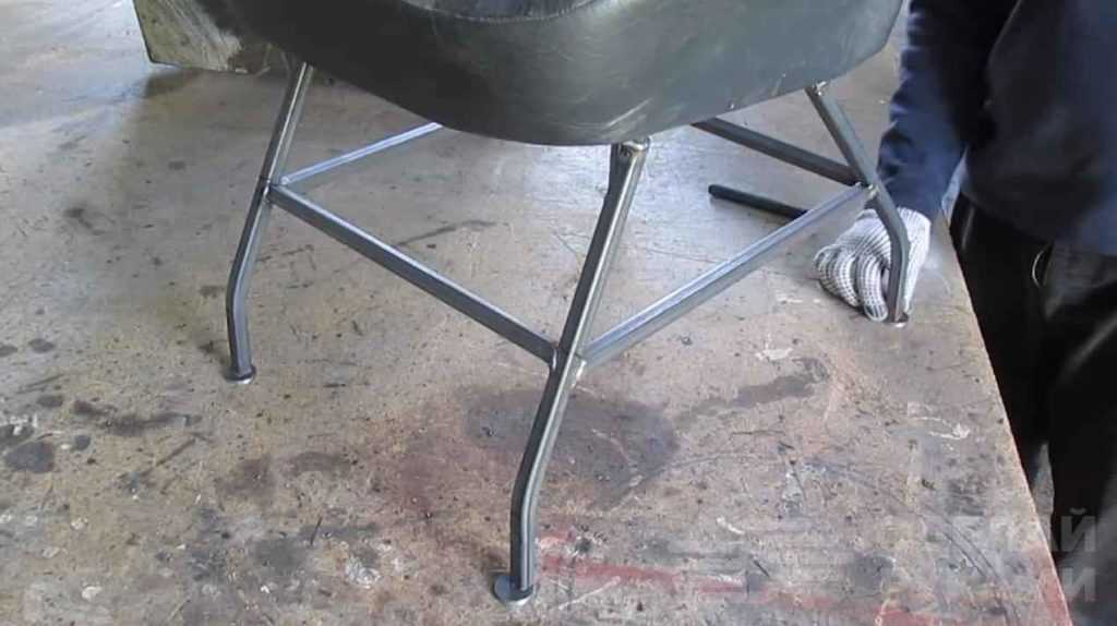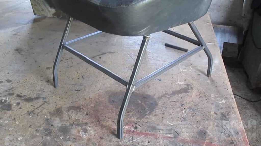 Далее привариваем ножки к металлическому контуру под сиденьем. Сначала лучше прихватить, выставить под углом 90 градусов, а потом только обварить полностью.