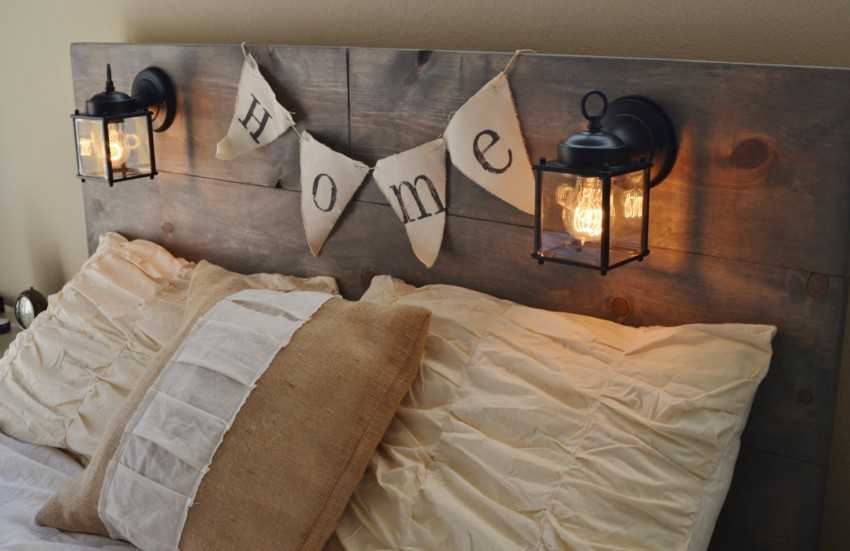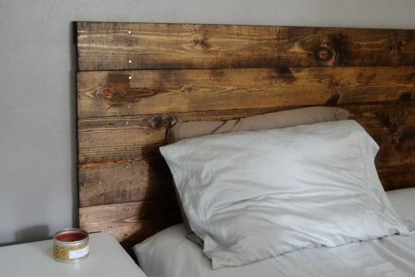 Если кровать не имеет изголовья, его придется сделать самому. Доски нужно набить на деревянный каркас с минимальным шагом (3-5 мм) или вплотную. Надо учитывать влажность в помещении. Чтобы закрепить МДФ или фанеру на остов, подготавливают лист, размеры которого будут соответствовать габаритам основания.