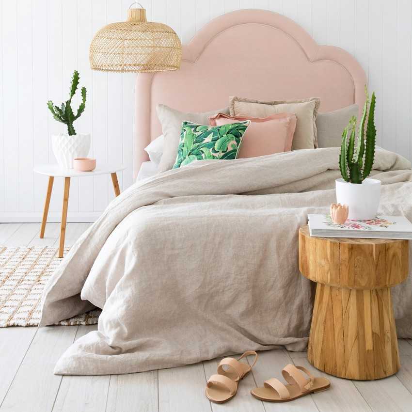 Светло-карамельную угловую кровать с изголовьем, украшенным тканью с ромбовидной вышивкой, можно расположить в персиковой спальне со светло-коричневым полом. Завершите интерьер темно-коричневой тумбочкой, нежно-розовой картиной над кроватью и настенными светильниками.