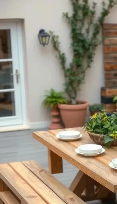 Шаг 5: Декор. Украсьте стол и скамейки подушками, пледами и другими декоративными элементами. Добавьте растения в горшках для создания уютной атмосферы.