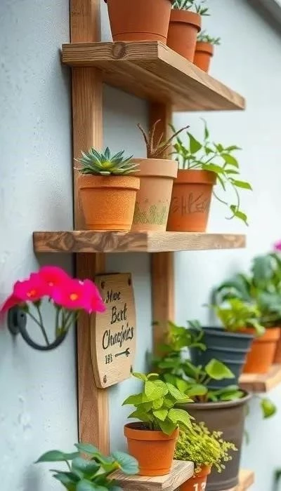 4. Полки для цветов и растений: Вертикальное озеленение – один из главных трендов в ландшафтном дизайне 2025 года. Полки для цветов и растений можно сделать из дерева, металла или поддонов. Они помогут создать уютную и живописную атмосферу на террасе.