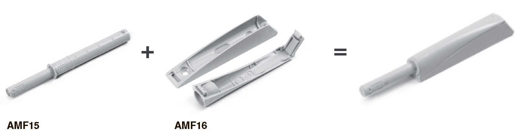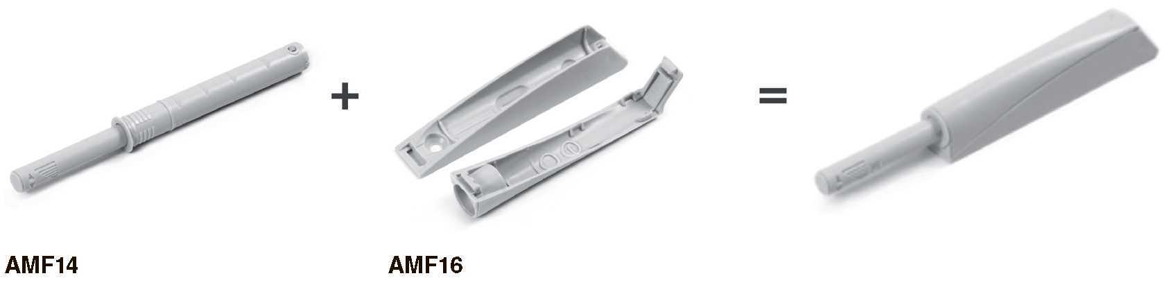 В случае установки данной модели методом наложения для сохранения внутренней эстетики мебели предлагается удобный накладной корпус AMF16, выполненный из пластика аналогичного цвета. AMF16 приобретается отдельно. Тандем фурнитуры будет выглядеть следующим образом.