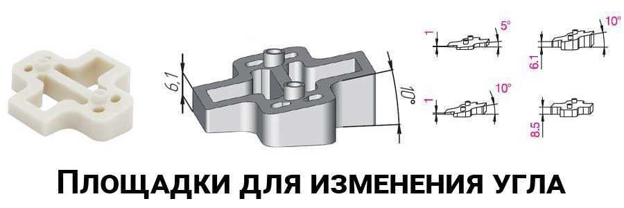 Площадки делают из пластика и металла. Её подложите под установочную планку петли, и угол изменится в нужную сторону. Например, накладка на 10 градусов может, как увеличить, так и уменьшить угол установки фасада.