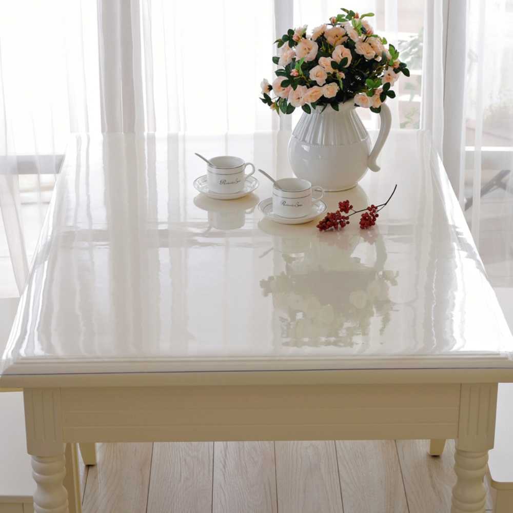 «Мягкое стекло» — так чаще называют подобную скатерть. Она защищает от повреждений, а также загрязнений, легко моется и смотрится красиво. Прозрачность долгое время радует глаз, не закрывая поверхность.