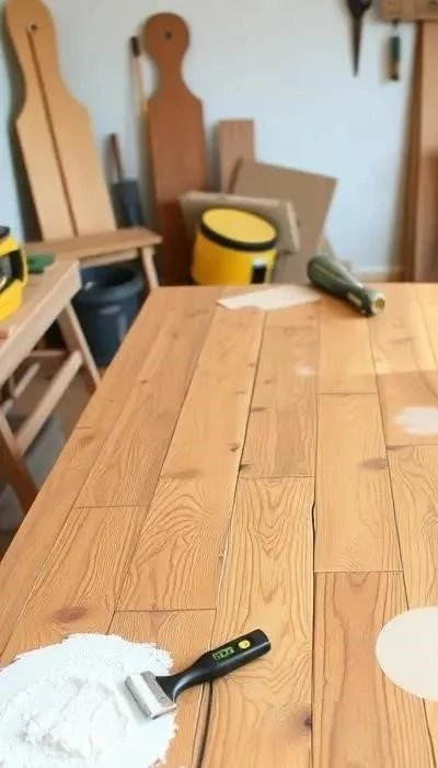Шаг 3: Ремонт. Заполните трещины и сколы шпатлевкой по дереву. Дайте шпатлевке высохнуть, затем отшлифуйте ее, чтобы выровнять поверхность. При необходимости укрепите расшатанные соединения с помощью клея для дерева и струбцин.