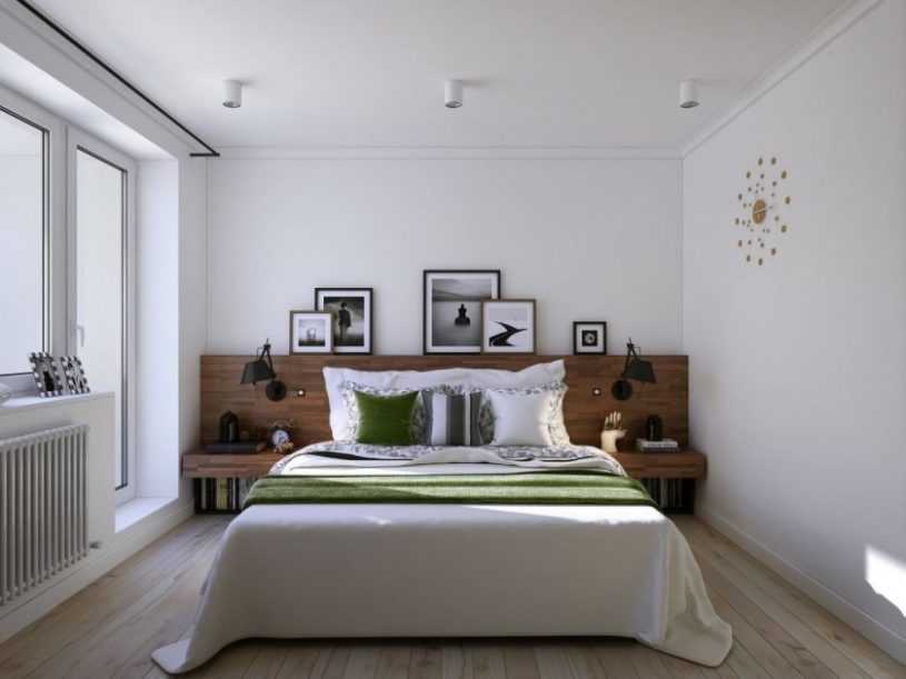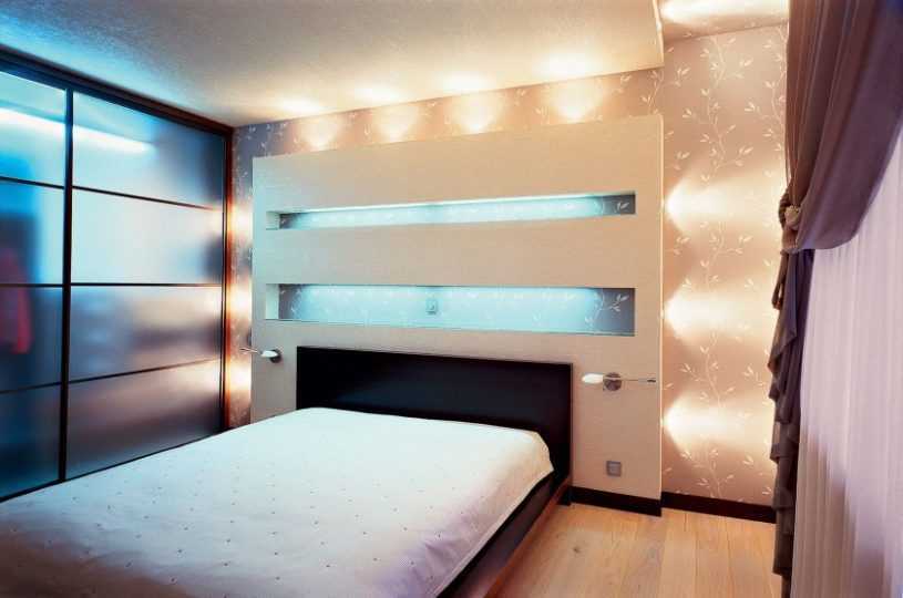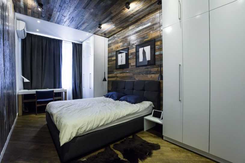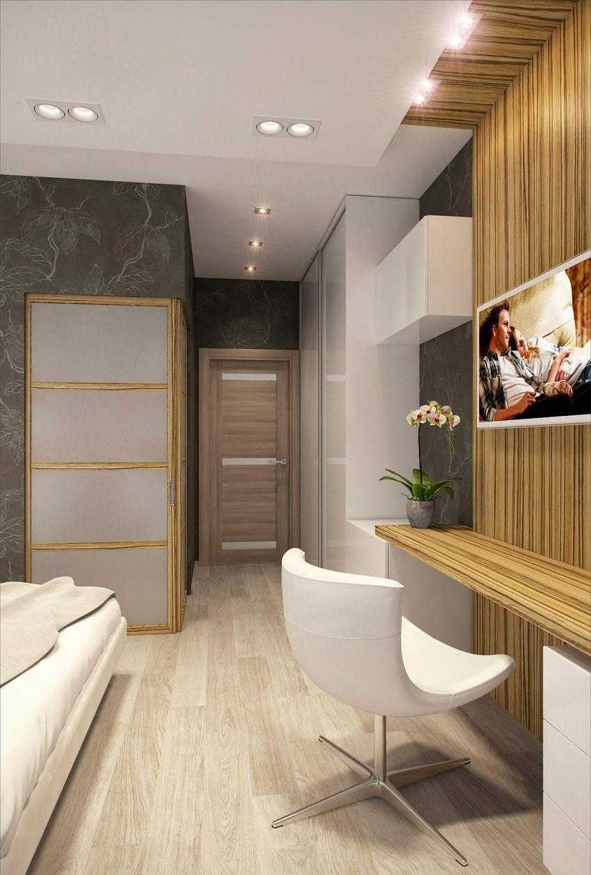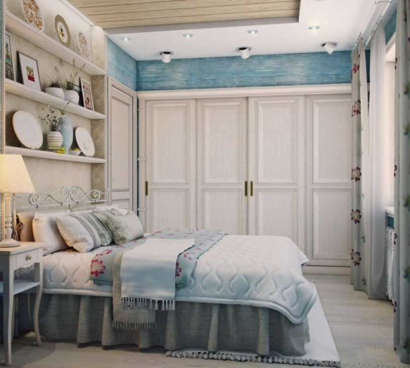 В маленькой прямоугольной спальне в длинной стене можно сделать небольшую нишу, внутри которой расположить гардеробную. Сделать полки и вешалки для хранения обуви и одежды. Такой гардероб ничем не закрывается, кроме штор на карнизе – но это должны быть красивые шторы.