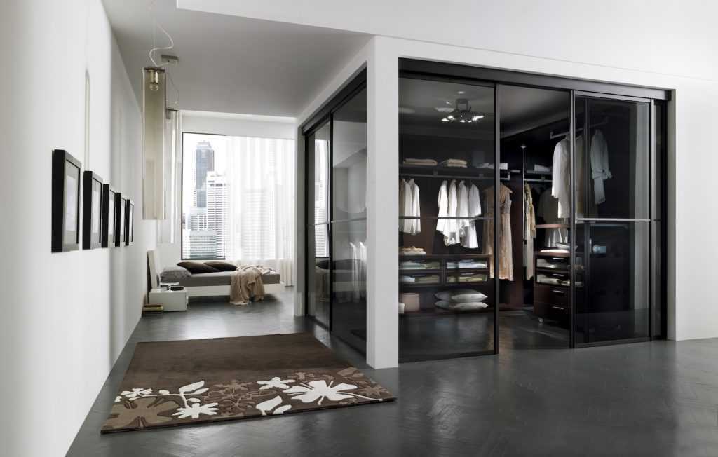 Дизайн спальни с гардеробной комнатой может выглядеть по-разному. Необычные проекты актуальны для больших спален. Так, в нише обустраивается просторное помещение, которое закрывают несколькими раздвижными стеклянными дверями. Внутри имеются ящички, тумбочки, а также конструкции для хранения одежды и обуви. Имеется точечное освещение или светодиодная подсветка. Цветовая гамма в основном не отличается от цветов в спальне.