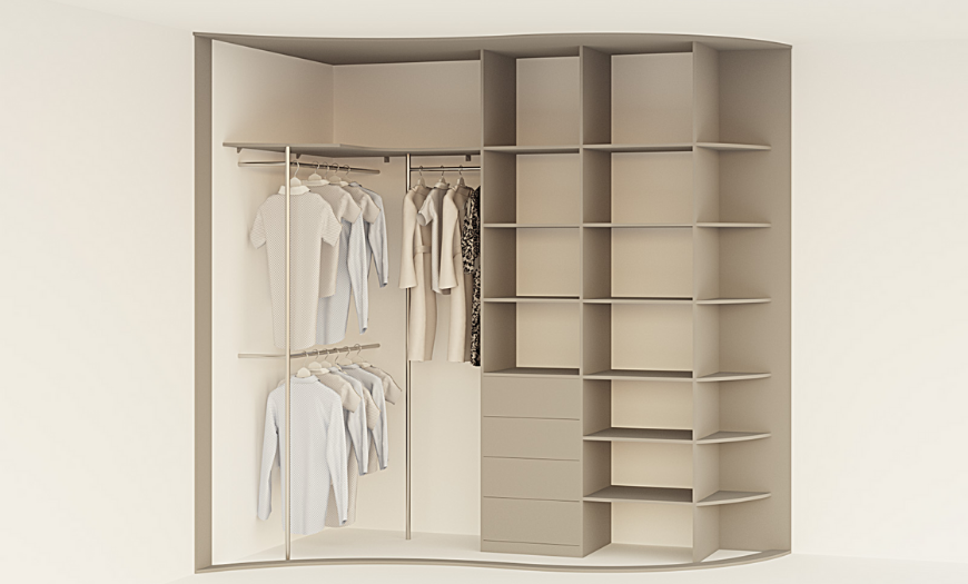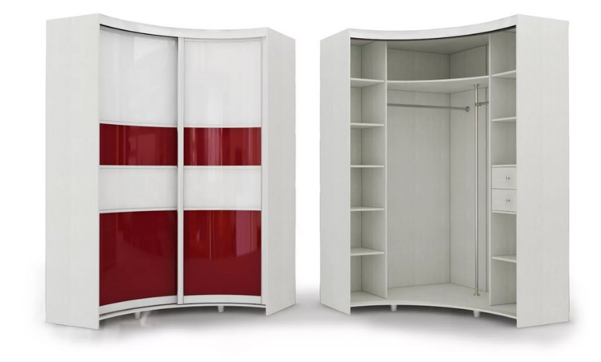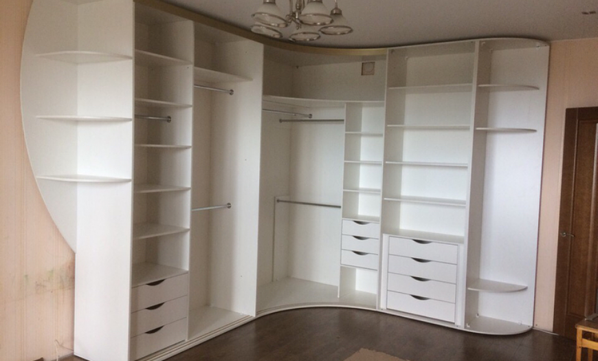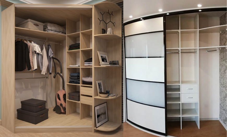 Радиусные шифоньеры обладают гибкими формами (извилистыми, вогнутыми, выпуклыми), поэтому идеально вписываются в любую планировку. Их можно располагать как вдоль прямой стены, так и в углу комнаты.