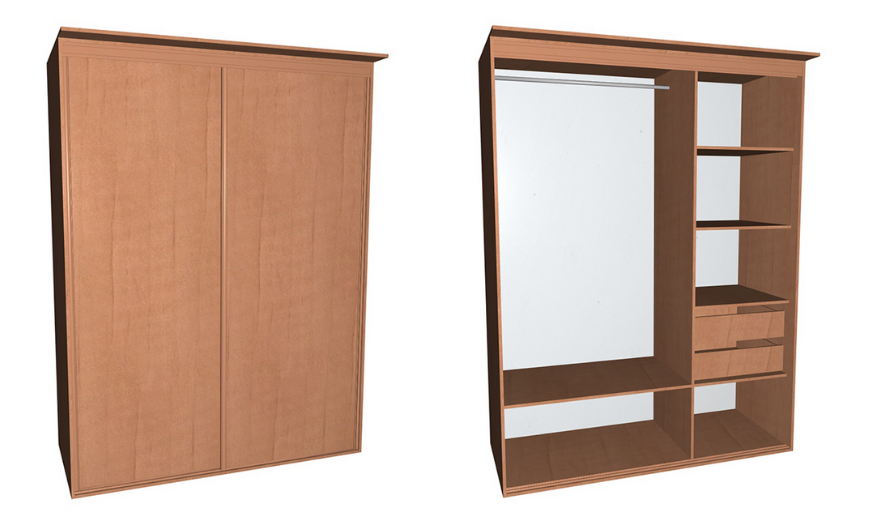 Расчет размеров дверей шкафа производиться по тем же правилам что и для мебельных фасадов, а именно – при распиловке из ДСП заготовок для накладных дверей шкафа (устанавливаемых в притвор) необходимо учитывать толщину кромки, которой будем облицовывать торцы и по 3 миллиметра на зазор с соседней дверцей.