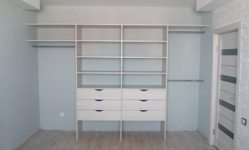 Для этого комната для хранения вещей должна обладать оптимальной шириной. Если выбрали дизайн без дверей, но присутствуют ящички. В этом случае глубина должна составлять четыре глубины шкафа.