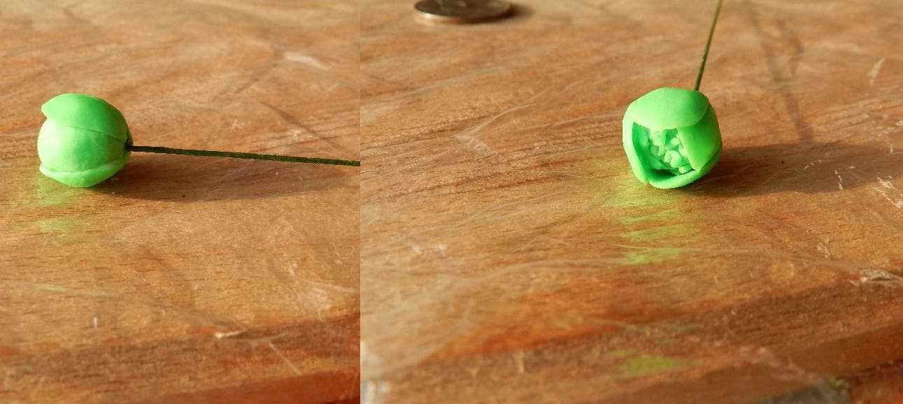 Отделяем четыре кусочка глины ярко-зеленого оттенка. Делаем из них шарики и при помощи стека придаем форму лепестка.