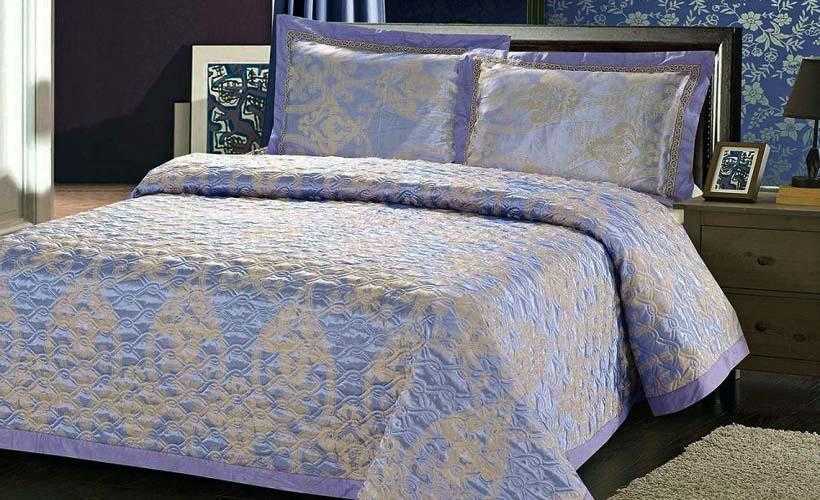 В стеганых покрывалах из жаккардового сатина для изнанки используют полиэстер, внутренний слой наполняют синтепоном. К краям изделия, которое спускают до пола, пришивают рюши и воланы. Стеганое покрывало из сатина жаккарда такое же теплое, как и одеяло, но чаще набрасывается на кровать или диван как накидка, поскольку удивляет витиеватыми узорами, дополняет классический и восточный стиль.