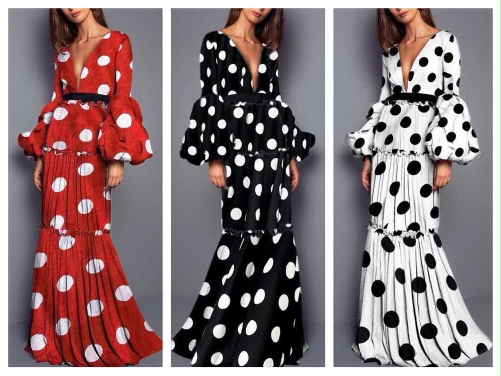 Наличие сложного кроя и большого количества вытачек в попытке посадить вещь по фигуре могут поломать рисунок, а вот оборки, рюши, воланы, пышные рукава – это те модные детали, которые будут стильно выглядеть на ткани с принтом polka dots. Модными в 2021-2022 будут модели с воланами и оборками на юбке, а также украшенные рюшами по горловине или вокруг вырезов на рукавах.