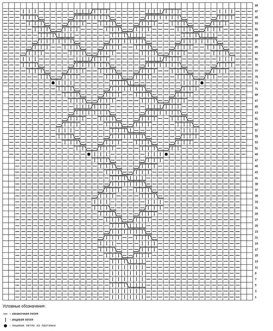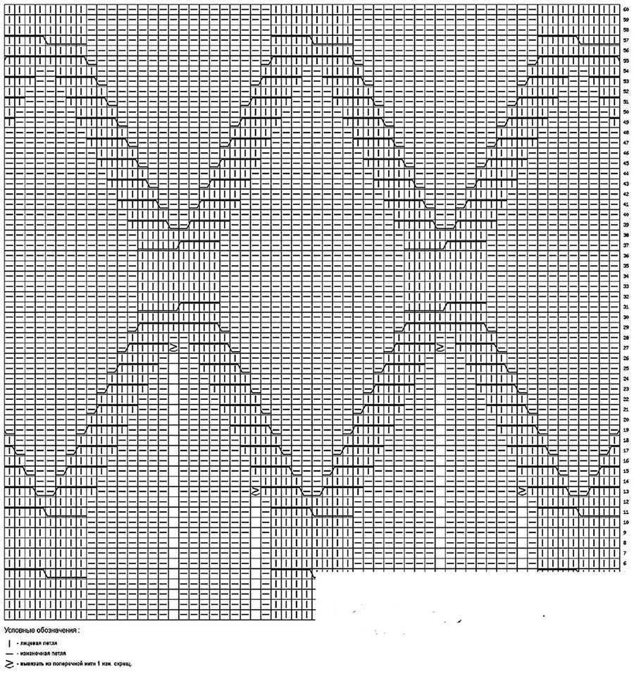 После этого изделие необходимо снова провязать, согласно рисунку, который представлен выше, после этого начать убавление петель каждые 24 ряда в изнаночных петлях;