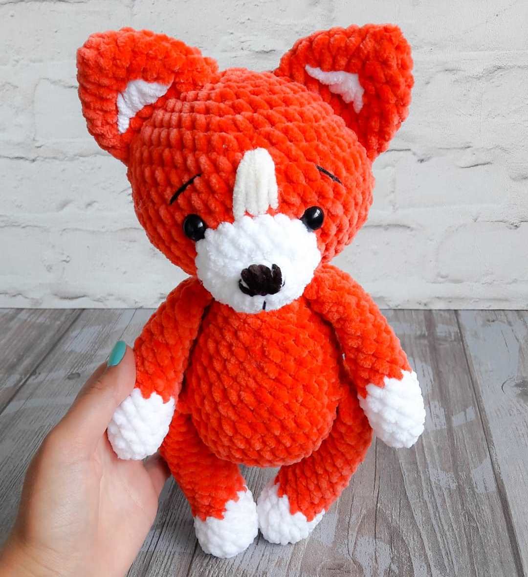 Ножки (2 детали) Белой пряжей: 1: 2 вп, во вторую петлю от крючка 6 сбн (6) 2: 6 пр (12) 3-4: 12 сбн 5: 2 уб, 8 сбн (10) Меняем цвет на рыжий 6-18: 10 сбн Склалываем пополам и провязываем 5 сбн.