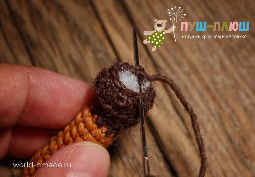 Заканчиваем вязание соединительным столбиком, оставив длинный край нити, с помощью которого мы будем соединять голову и туловище. Наполняем голову синтепоном и связываем детали между собой.