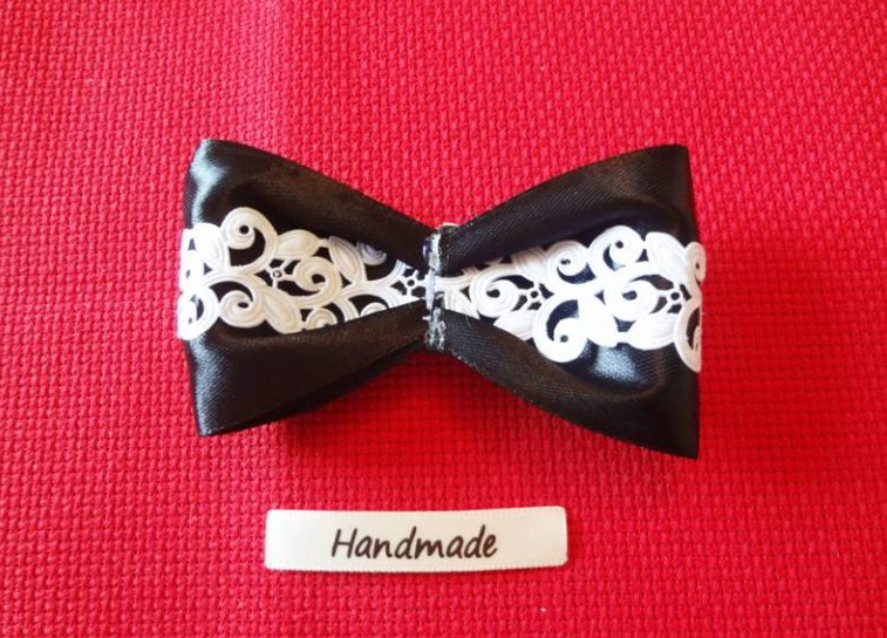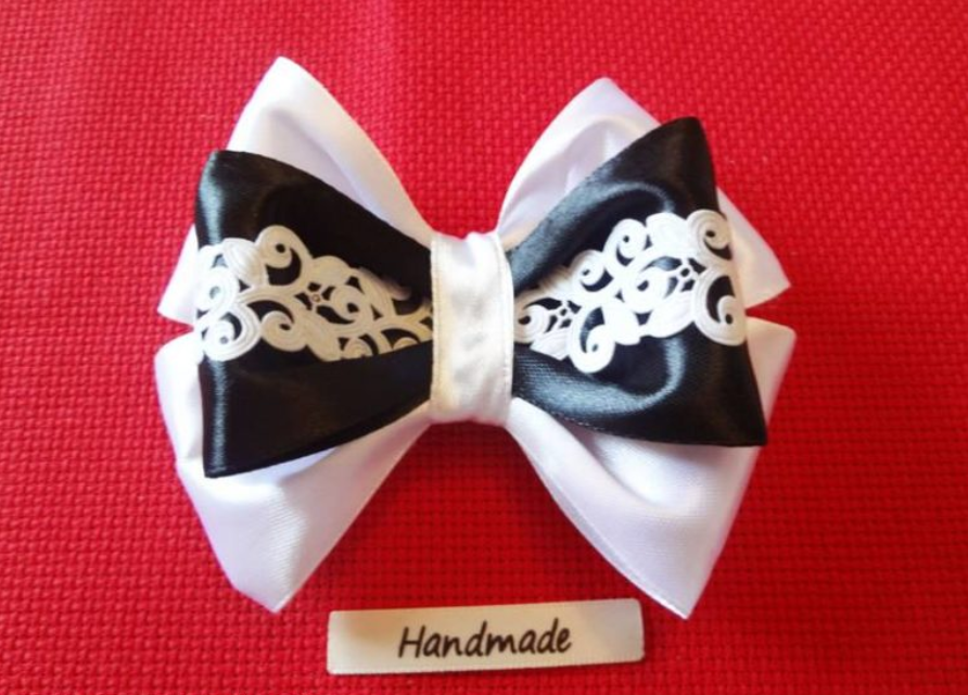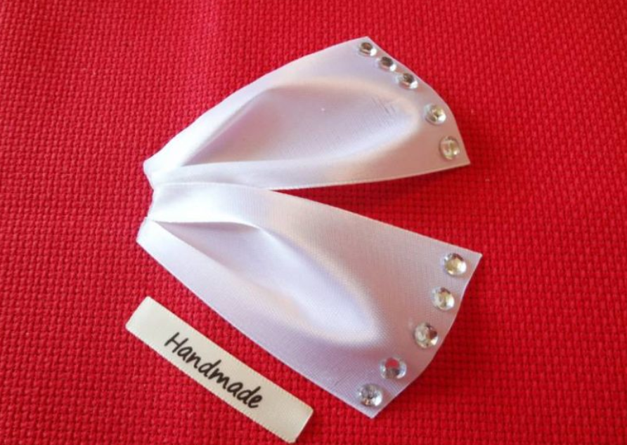 Лучшие украшения для предметов одежды или аксессуаров девочек – это не только рюши, кружева и цветы. Обязательным атрибутом является и бантик, в форме которого будет наша следующая заколка из ленты, своими руками выполненная. Она подойдет как для повседневного наряда, так и праздничного – это будет зависеть от выбранного нами сочетания цветов. Для нашей заколки понадобится три вида репсовых лент: широкие белая и розовая и тонкая в мелкий горошек аналогичных оттенков. Оба банта будут изготовлены из первых и по структуре будут представлять собой две перекрещенные восьмерки. Поэтому делаем 4 отрезка длиной 20 см, отмечаем на каждом центр и складываем к нему боковые края. Теперь опаливаем края, прошиваем посередине и стягиваем. Итак, наши банты почти готовы.