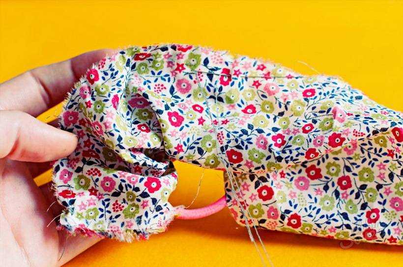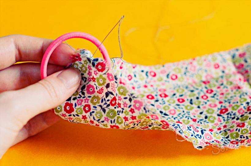 Сложите отрезок ткани вдоль, лицевой стороной вовнутрь. Возьмите резинку в руки. Концами материала обхватите заготовку с внутренней стороны.