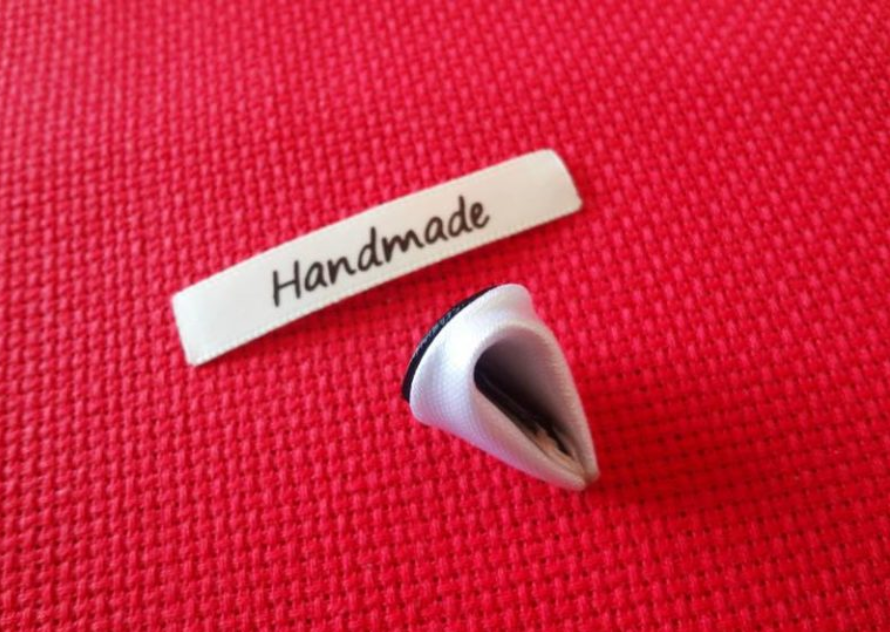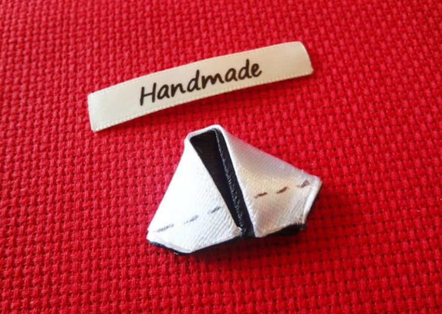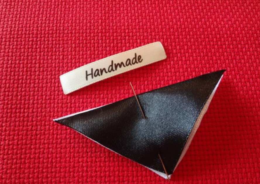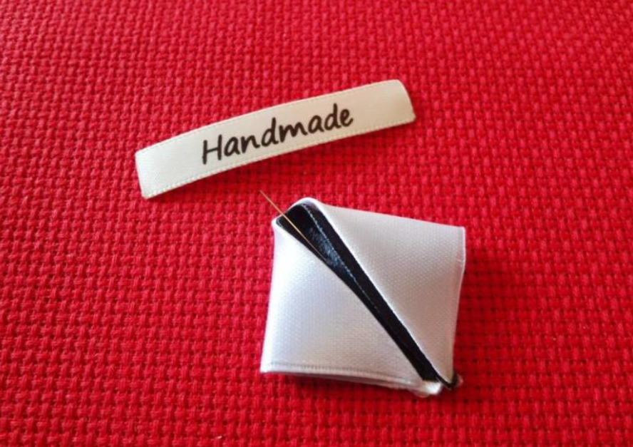 Чтобы изделие имело завершенный вид, дополняем его верхним элементом, кусочком ленты. Сначала крепим заготовку по центру, а после подгибаем края и фиксируем с изнанки банта.