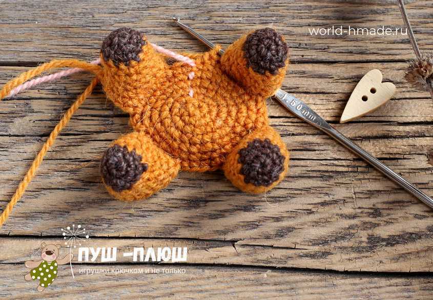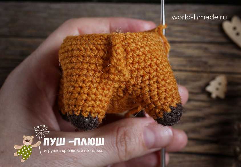 - Связать 4 кружка-копытца из темной пряжи и пришить к конечностям этой же нитью.