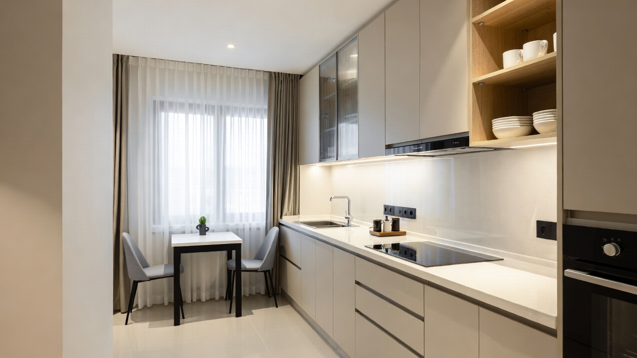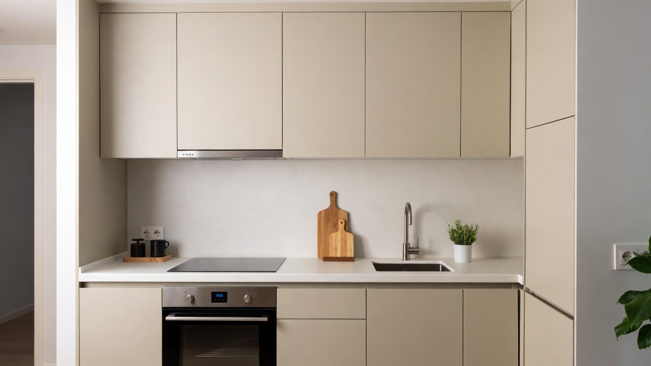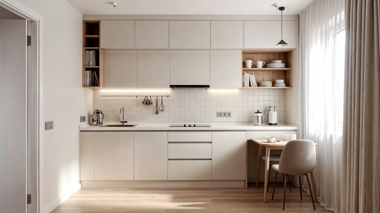 В студиях кухня объединена с жилой зоной и спальней. Главная задача здесь — сделать готовку незаметной и максимально сэкономить пространство. Для студий чаще всего заказывают прямые (линейные) кухни. Важнейшее требование — визуальная интеграция. Мебель не должна выглядеть слишком «кухонной». Заказчики выбирают гладкие матовые фасады без ручек (система push-to-open или скрытые профили Gola), встроенную и бесшумную бытовую технику. Высота гарнитура часто проектируется под самый потолок — это решает проблему нехватки мест для хранения утвари и визуально вытягивает комнату вверх.